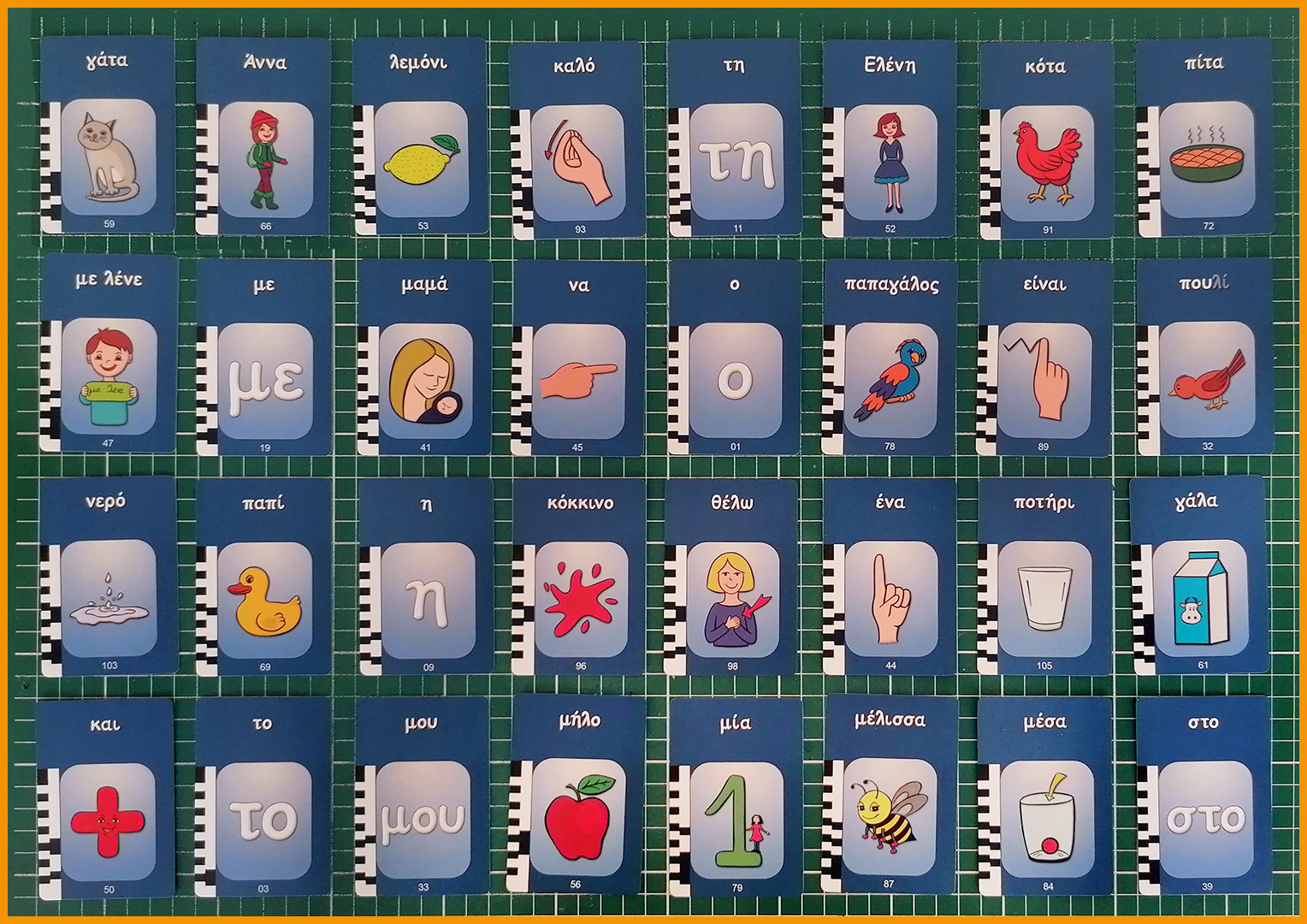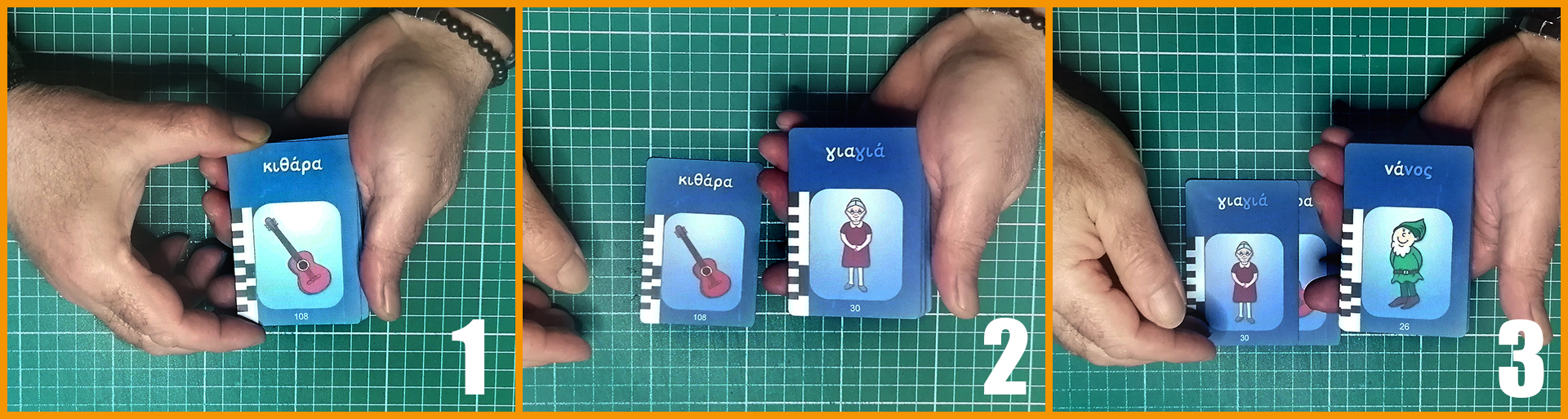 Χρησιμοποιήστε τις πρώτες 20 κάρτες του πακέτου Α (αριθμημένες 1-40). Αυτές έχουν στη μία όψη μια λέξη που ξεκινά με μία συχνά χρησιμοποιούμενη συλλαβή και στην άλλη όψη μόνο την πρώτη συλλαβή. Ιδανικές για εκμάθηση και αναγνώριση συλλαβών.