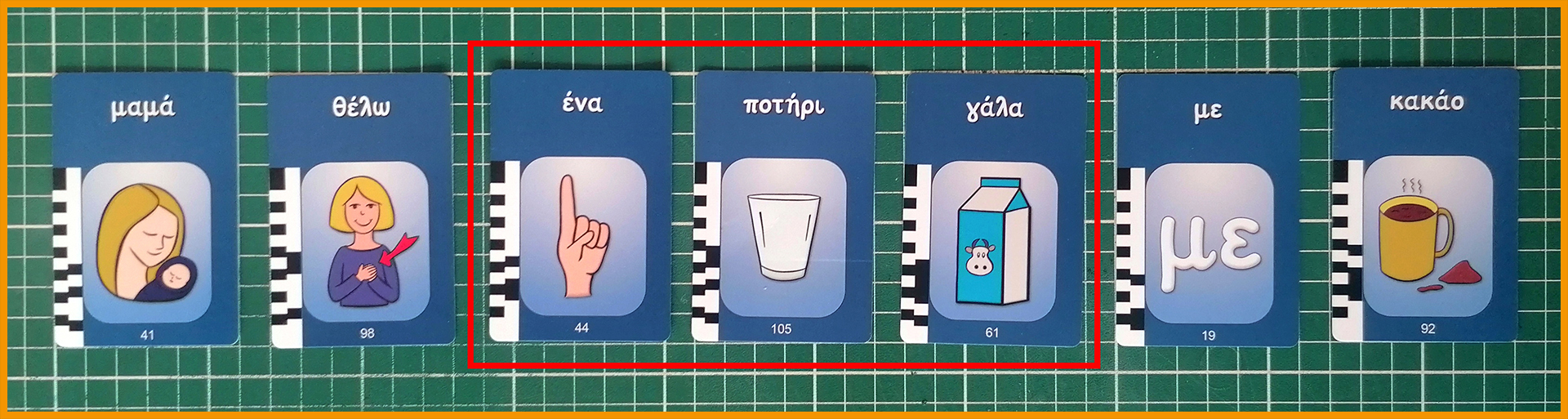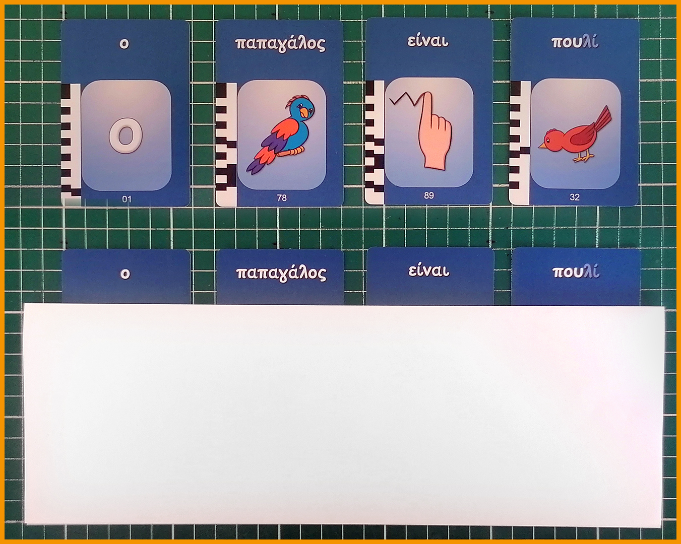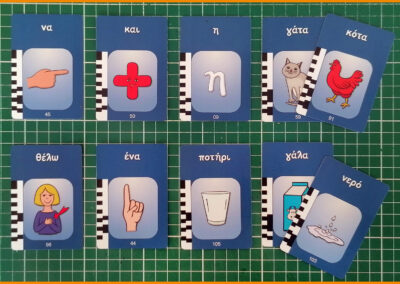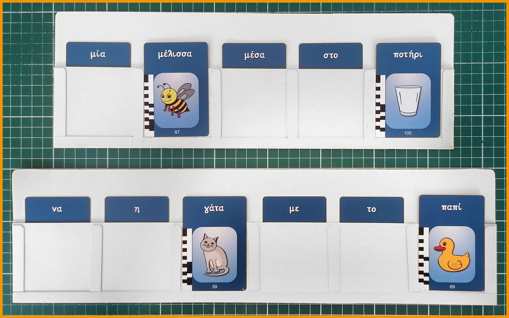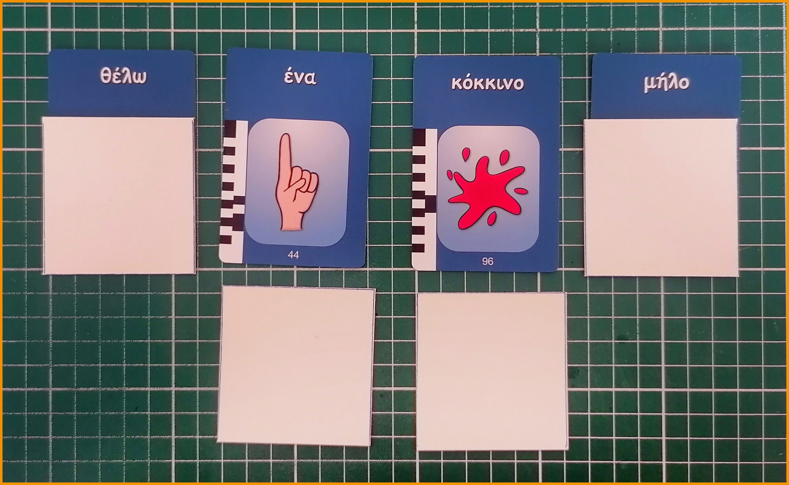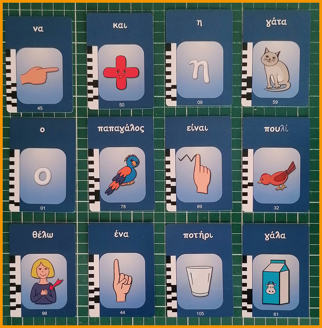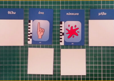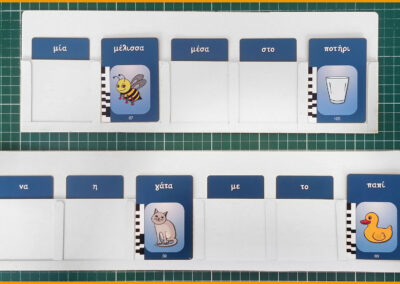 Αλλάξτε λέξεις σε υπάρχουσες προτάσεις τοποθετώντας επιπλέον κάρτες από πάνω. Για παράδειγμα, μετατρέψτε το “να και η γάτα” σε “να και η κότα” ή το “θέλω ένα ποτήρι γάλα” σε “θέλω ένα ποτήρι νερό”.