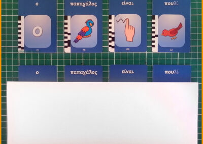 Σχηματίστε προτάσεις με τις κάρτες και καλύψτε τις εικόνες με χαρτόνια, ώστε το παιδί να επικεντρωθεί στις γραπτές λέξεις. Στόχος είναι η σταδιακή εισαγωγή στην πρώτη ανάγνωση.